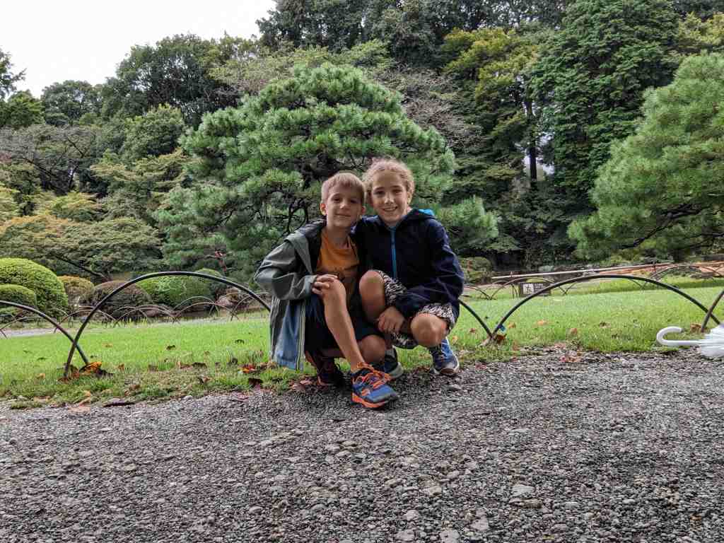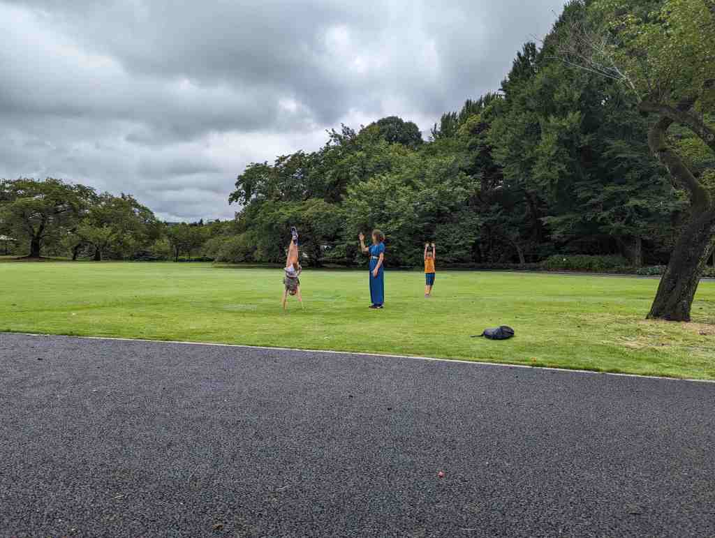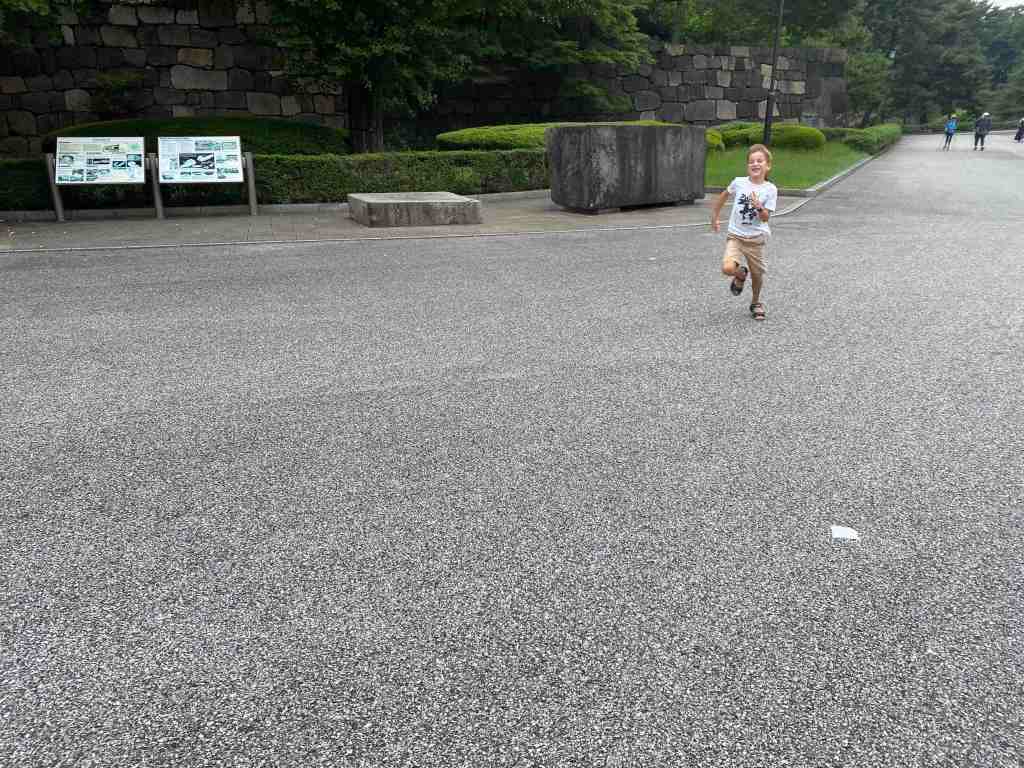 On a passé un pont pour passer au-dessus des douves du jardin du palais impérial. Là-bas, on a fait le tour du jardin et on a fait un 100 mètres chronométré.