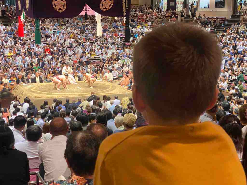 La photo en haut à gauche, les sumos se présentent. La photo en haut à droite : on était dans des petits carrés de 4 personnes pour regarder les combats. Quand les sumos se préparent à attaquer, ils se mettent accroupis sur les pointes de pieds et ils doivent poser leurs 2 mains au sol avant d’attaquer et de lancer le combat. Le poids moyen pour un sumo, c’est 150 kilos. Il mange à peu près 8 fois plus que les enfants. Il y avait énormément d’ambiance et à chaque beau combat, les gens acclamaient. Pour gagner un combat, il y 2 solutions. Soit il faut faire sortir son adversaire du cercle. Mais si il touche le bord du cercle, il n’est pas encore éliminé. Il faut qu’il pose une partie du corps à l’extérieur pour être éliminé. Soit le sumo qui pose autre chose que ses pieds sur le tatami perd.