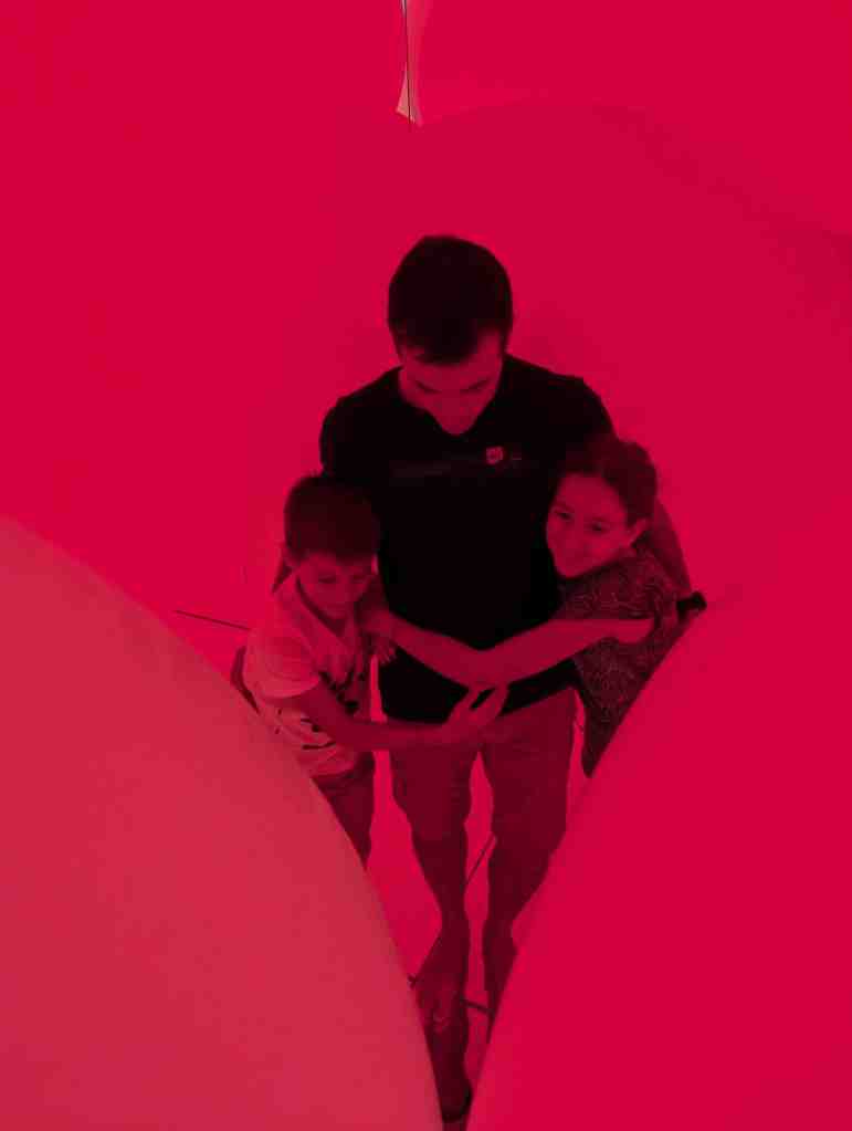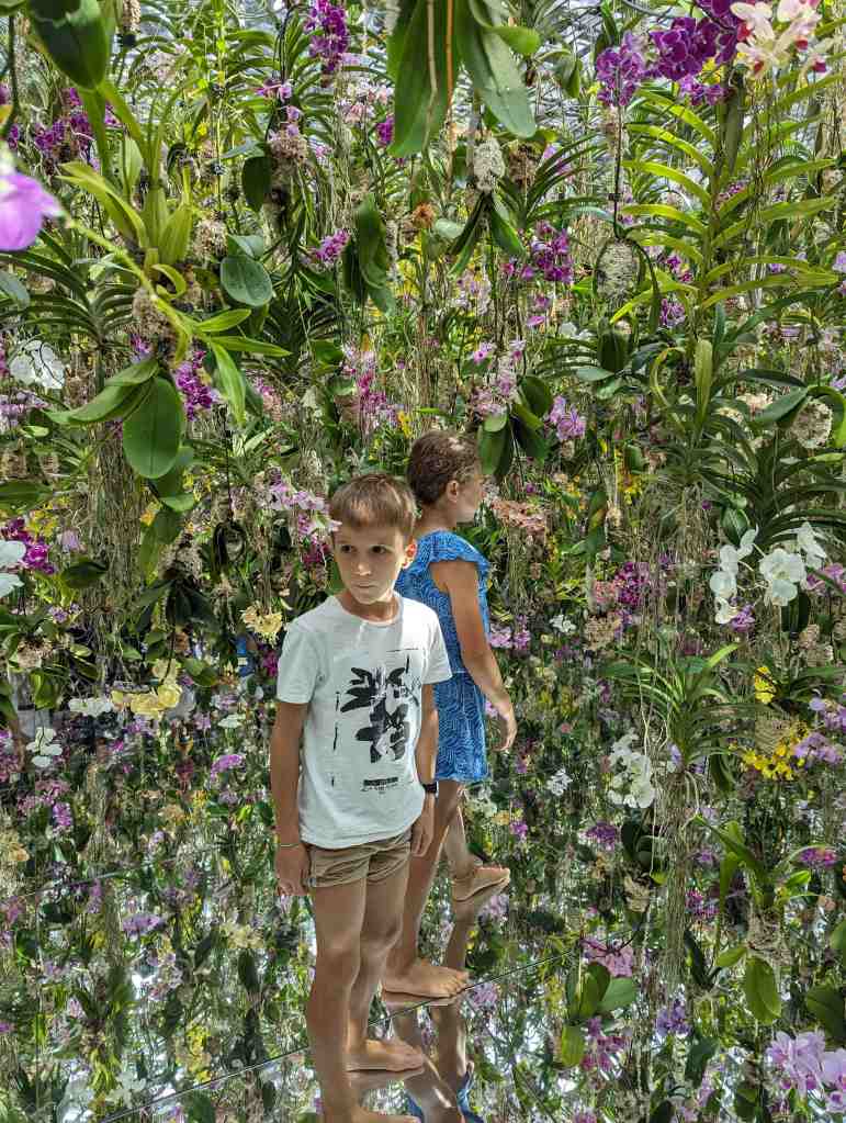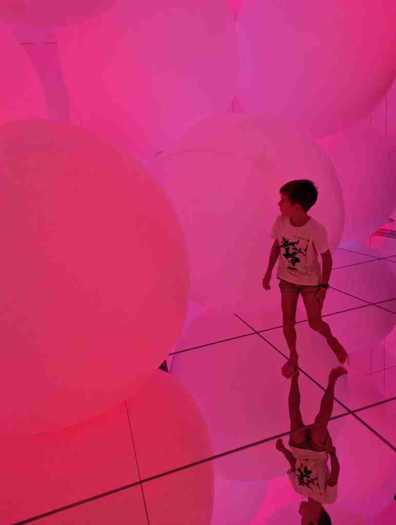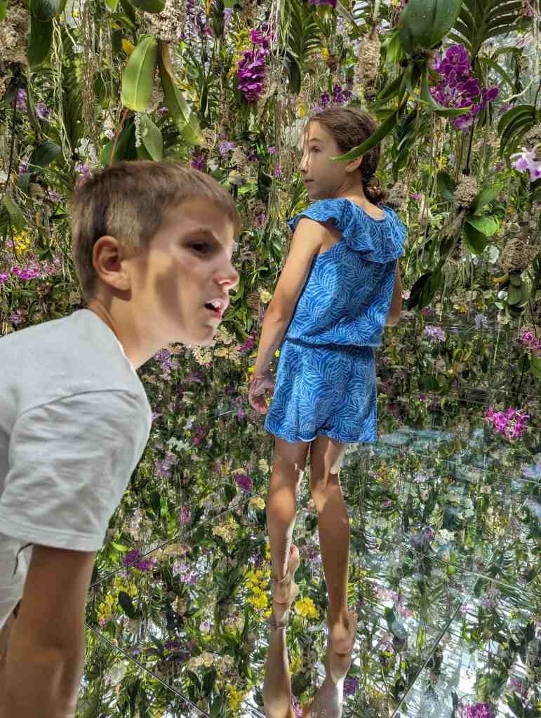 On est allé dans un musée qui parlait de l’eau et de la nature. Il y avait un endroit où on marchait dans l’eau jusqu’au genou et où était projetées des images de poissons. Il y avait un endroit où il y avait des miroirs de partout et des fleurs qui tombaient du plafond. C’était rigolo mais trop court !