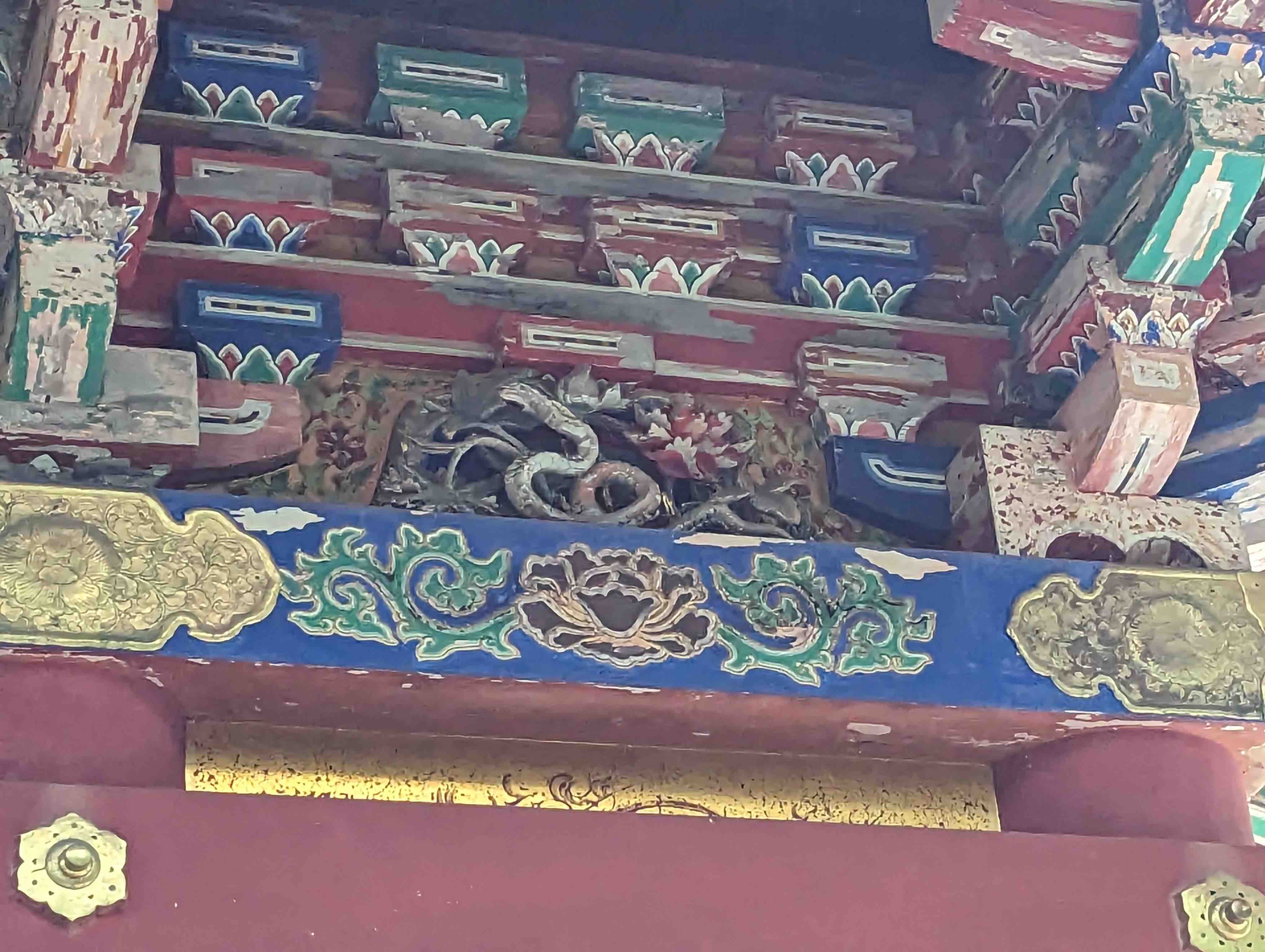 Sur cette pagode, il y a les animaux des 12 signes astrologiques. Ici on voit une chèvre, un cheval et le serpent.