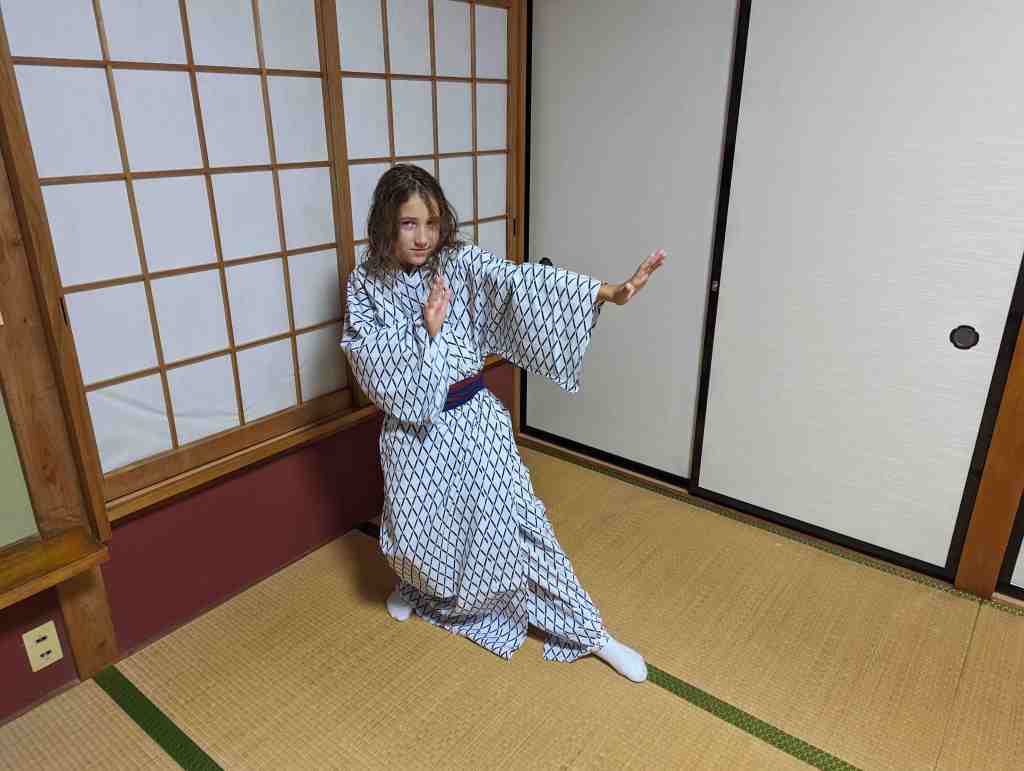 On doit porter des yukatas. C’est une tunique longue avec sa ceinture C’est leur pyjama.