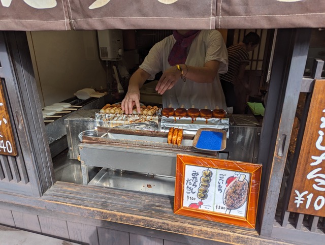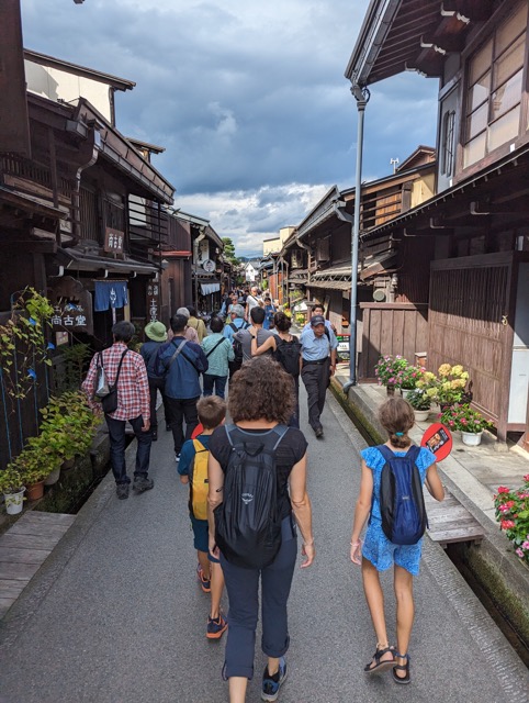 Takayama : Jolie petite ville avec un vieux centre typique très agréable, fleuri, plein d’échoppes artisanales et de petits restaurants japonais et autres. Nous sommes tombés le we du festival culinaire : on a goûté aux brochettes de pâte de riz (sorte de purée gluante de riz) et aux glaces japonaises notamment, et Micka a dégusté plusieurs verres de saké. Les enfants ont participé à un atelier bracelets.