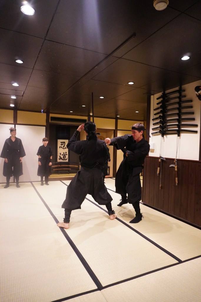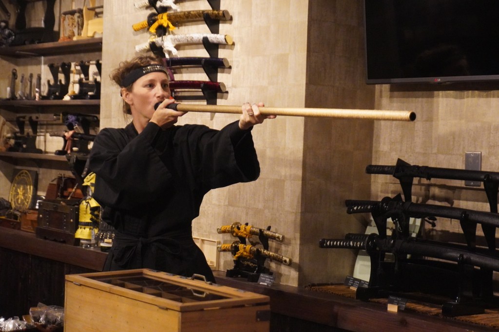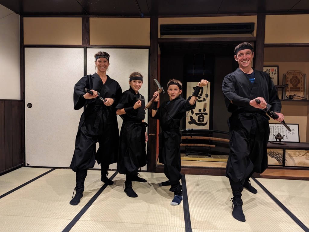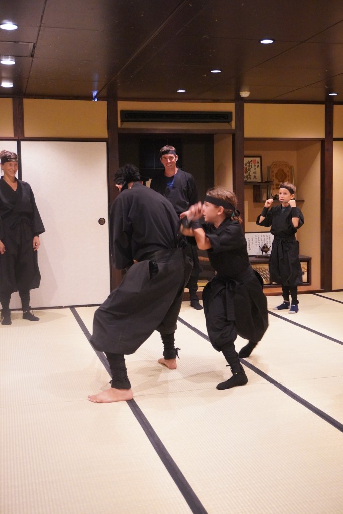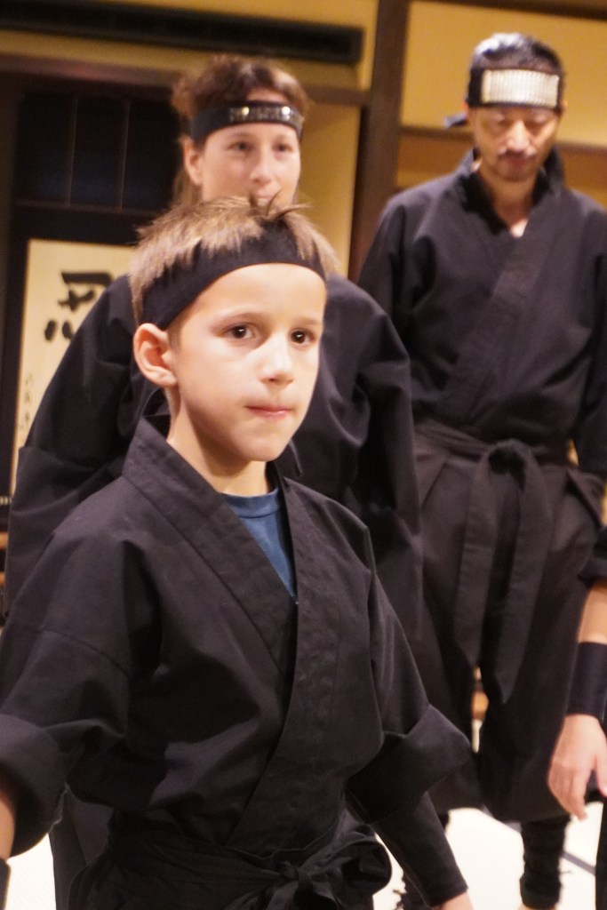 Pour la dernière journée à Kyoto, une surprise pour les enfants : initiation aux techniques des ninjas. Maniement du sabre, du poignard et de la faucille, technique de déplacement silencieuse et d’évitement des pièges au sol, lancer de différents shuriken, jet à la sarbacane, etc… Trop marrant pour tous les 4 !