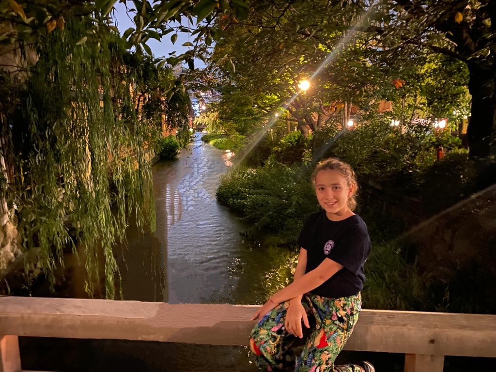 On finit la journée par un tour dans le quartier de Gion, le quartier des geishas. La plupart des petites boutiques sont fermées car c’est le jour officiel de la fête du sport. Du coup, on se promène aux alentours en longeant un joli ruisseau puis on mange comme les japonais, assis le long de la rivière Kamo un pique-nique nocturne. Micka trouve dans la supérette d’à côté une canette de whisky-coca Jack Daniels et moi une Smirnoff Ice, c’est parfait !! On est bien..