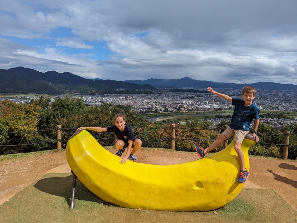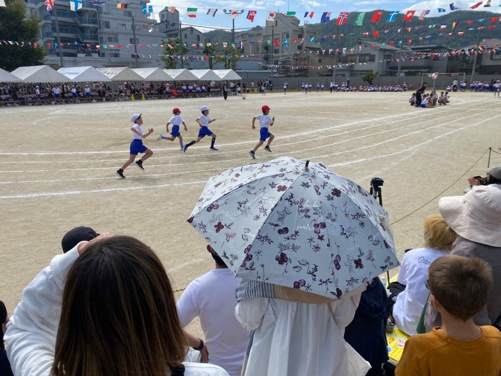 On commence par se diriger vers Kinkaku-Ji. On passe devant une école primaire, dans la grande cour ont lieu des courses, il y a plein de monde. C’est la fête du sport au Japon, les écoles accueillent les parents. On a le droit d’aller voir, alors on en profite. C’est organisé à la japonaise, donc les courses s’enchaînent sans perte de temps ! Léa et Axel sont contents de pouvoir entrer dans une école, c’était inespéré au Japon. Il y a pas mal d’infrastructures : grand gymnase, grande cour en terre avec une piste d’athlé tracée au sol, et une piscine extérieure 😳. Les salles de cours semblent être comme en France mais on a juste aperçu en coup de vent.
