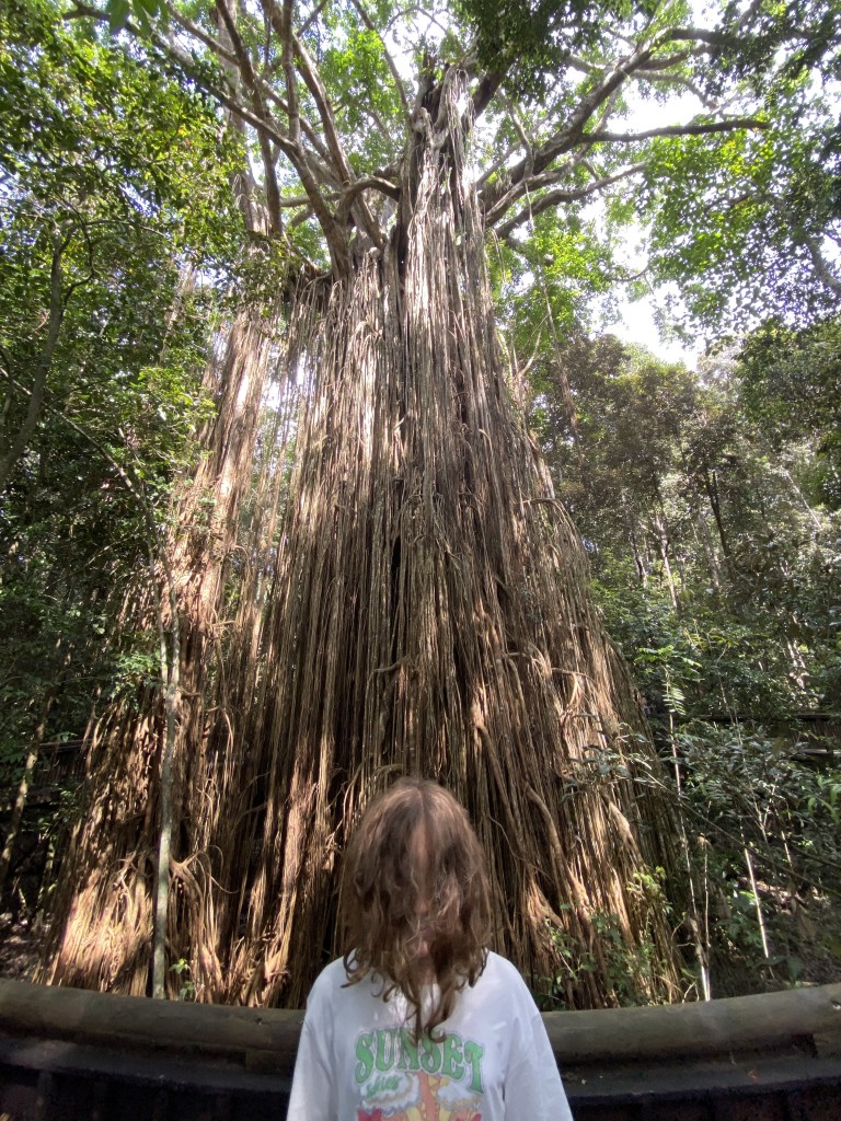 Les branches font d’autres branches qui, elles, tombent vers le sol et s’enracinent dans celui-ci. Ce figuier peut aussi coloniser plusieurs arbres comme ici où il en a colonisé 3…