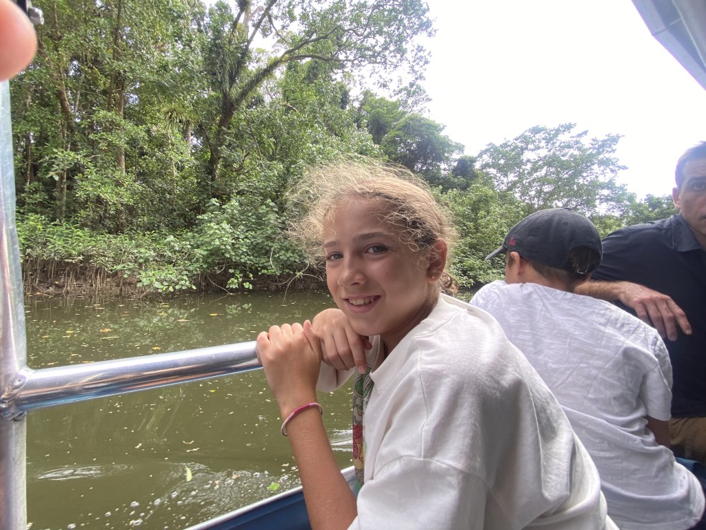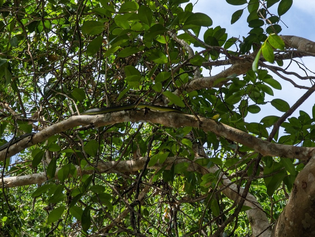 On a vu un serpent dans un arbre et 2 petits crocodiles, dont un de 3 ans. La plante rouge ci-dessous peut être mortelle si on la touche. Sur la 4ème photo, on peut voir des sortes de bouts de bois qui sortent de l’eau et qui forment une barrière naturelle infranchissable. On ne peut pas aller sur la rivière la nuit parce qu’il y a des tonnes de crocodiles. Et à marée basse, le bateau ne pourrait pas passer tellement il y a de crocodiles !