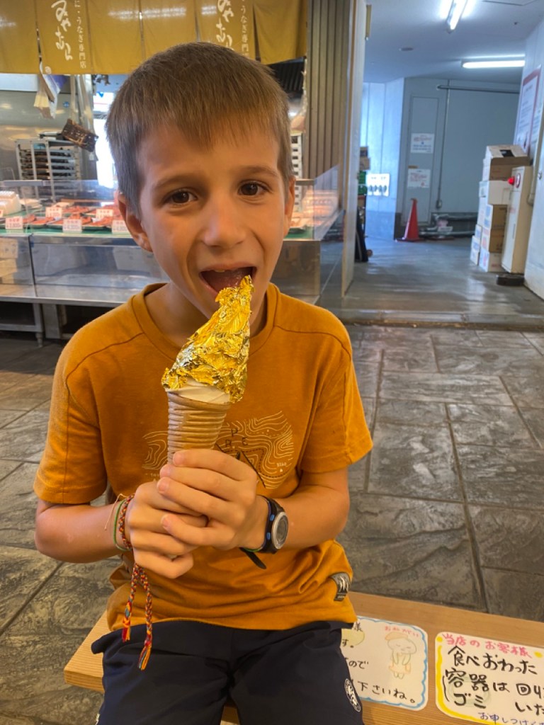 Beaucoup d’originalité pour cette glace ! Kanazawa signifie marécage de l’or car une légende raconte qu’un paysan en a trouvé dans ses terres. Ils utilisent la feuille d’or dans de nombreux domaines, y compris pour les glaces ! Nous avons goûté un parfum vanille, recouvert d’une feuille d’or.
