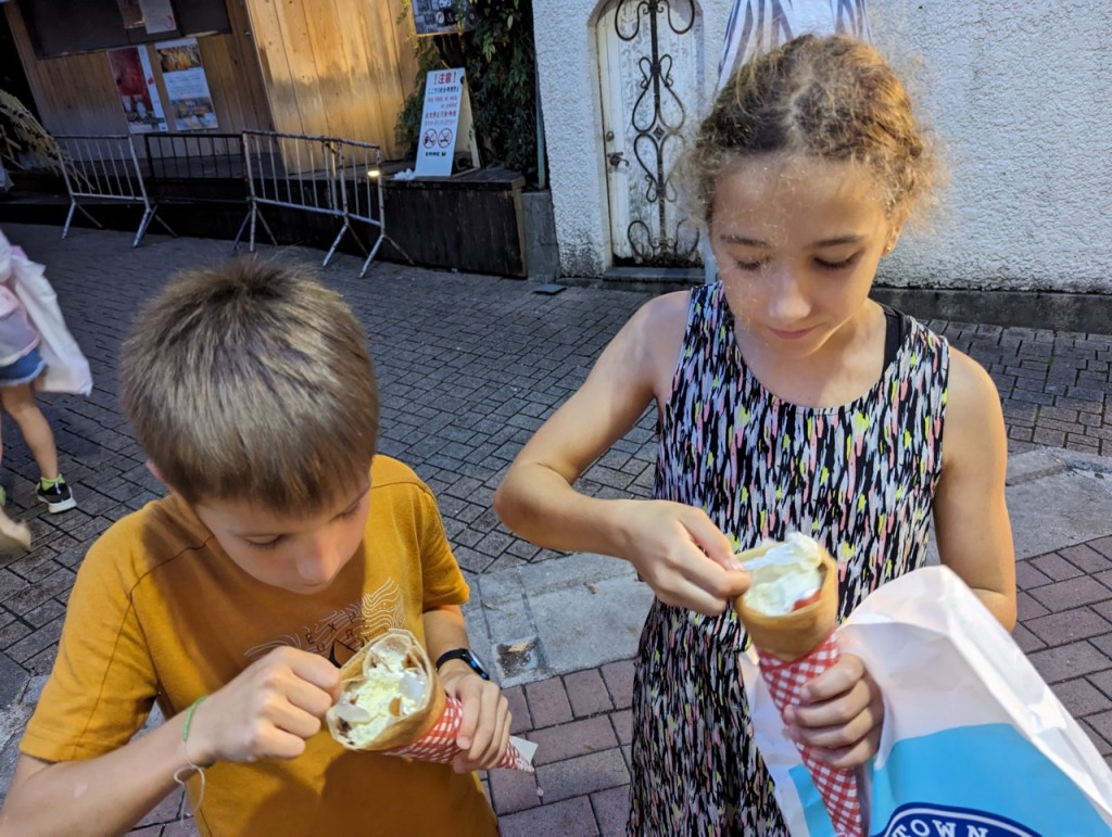 A Tokyo nous avons mangé une crêpe-glace. C’était très bon et très original car la crêpe remplaçait le cornet. Il y avait beaucoup de choix, tout était présenté en vitrine !