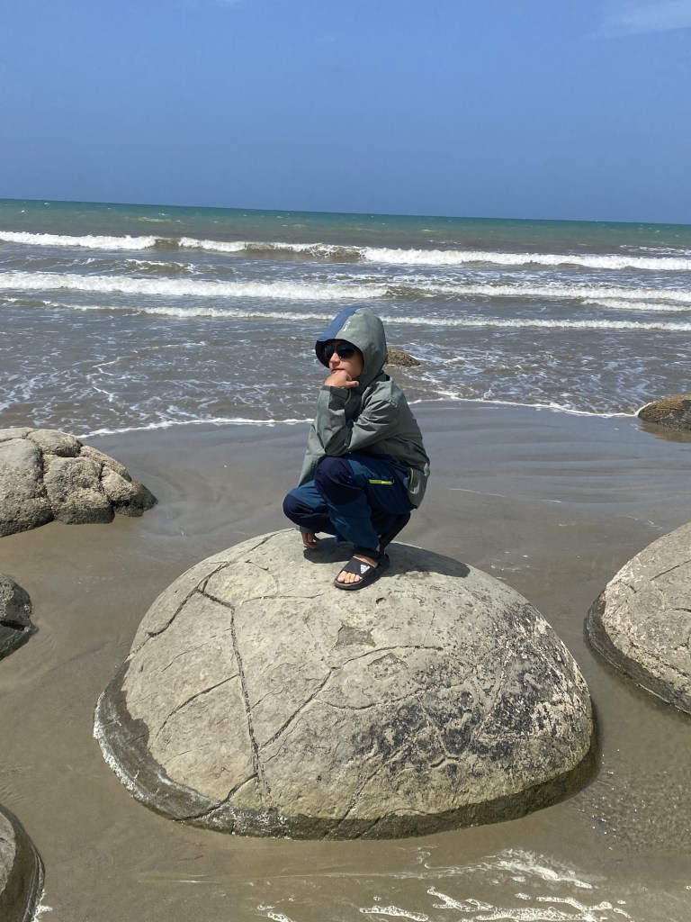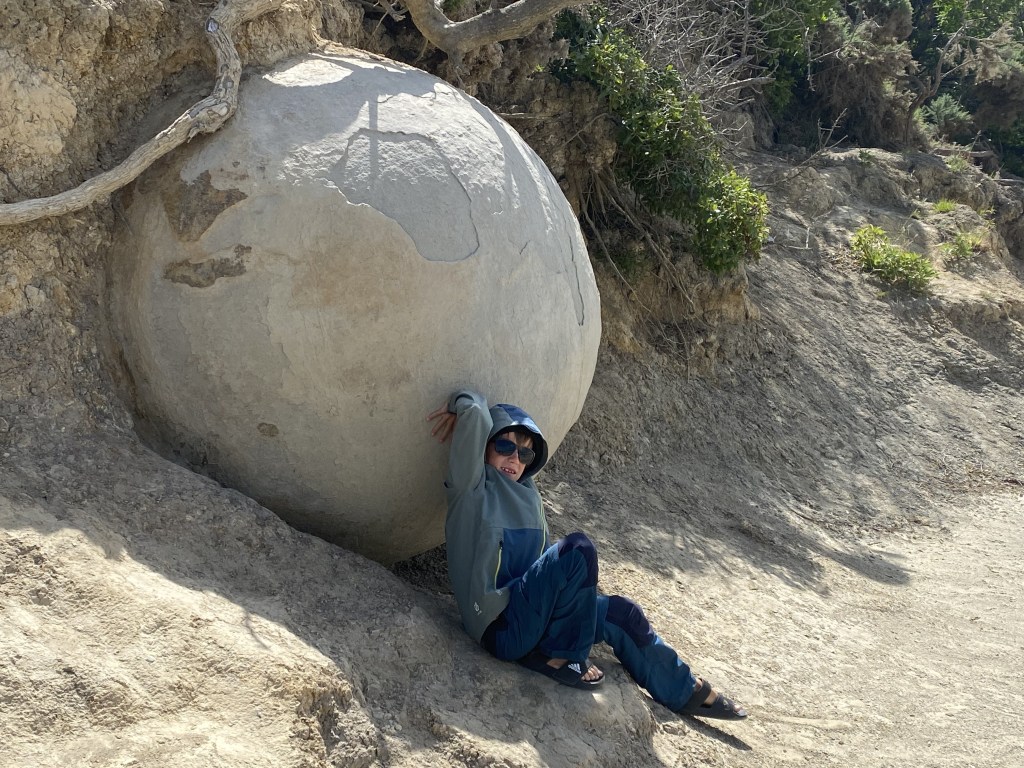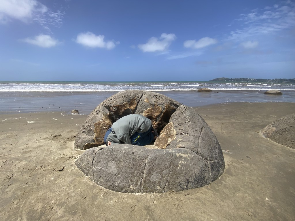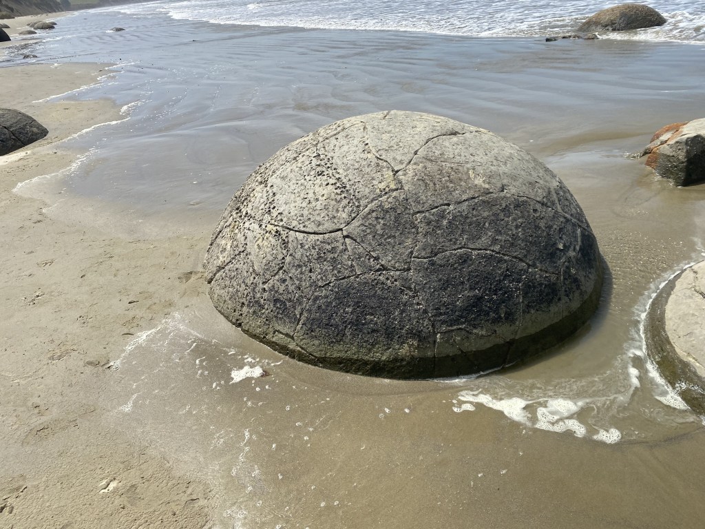 Voici ce qu’on appelle les Moeraki Boulders. Ces pierres peuvent faire jusqu’à 2 mètres de diamètre et peser jusqu’à 7 tonnes (plus lourd que deux voitures). Il y en a plein sur la plage mais on les voit moins bien qu’il y a 15 ans car le sable les a recouvertes un peu.