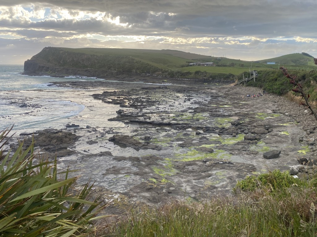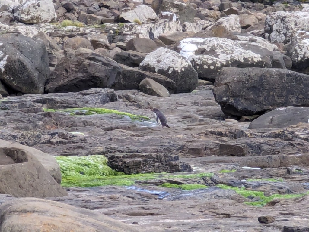 Nous sommes allés à un autre point de vue pour voir des pingouins à oeil jaune. Il n’y en a plus que deux à cette plage alors qu’avant il y en avait 24. A cette période, un des parents part à la pêche pendant que l’autre reste au nid avec le bébé. A la fin de la journée, quand le soleil se couche,  le parent revient pour donner à manger au bébé en lui vomissant dans la bouche. Le jour d’après, c’est l’autre parent qui part à la pêche. C’est très dangereux de pêcher car ils peuvent se faire tuer à tout moment sans que les autres membres de la famille s’en aperçoivent. Pour les observer, on va à un point de vue en haut d’une plage et on attend qu’ils rentrent de la pêche. Ca peut prendre longtemps !