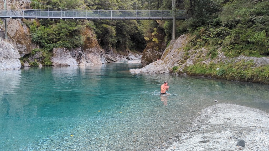 Cadeau de Noël pour tous les 4 : du River Surfing. C’était impressionnant, beaucoup de courant, de débit et de vagues. Génial !