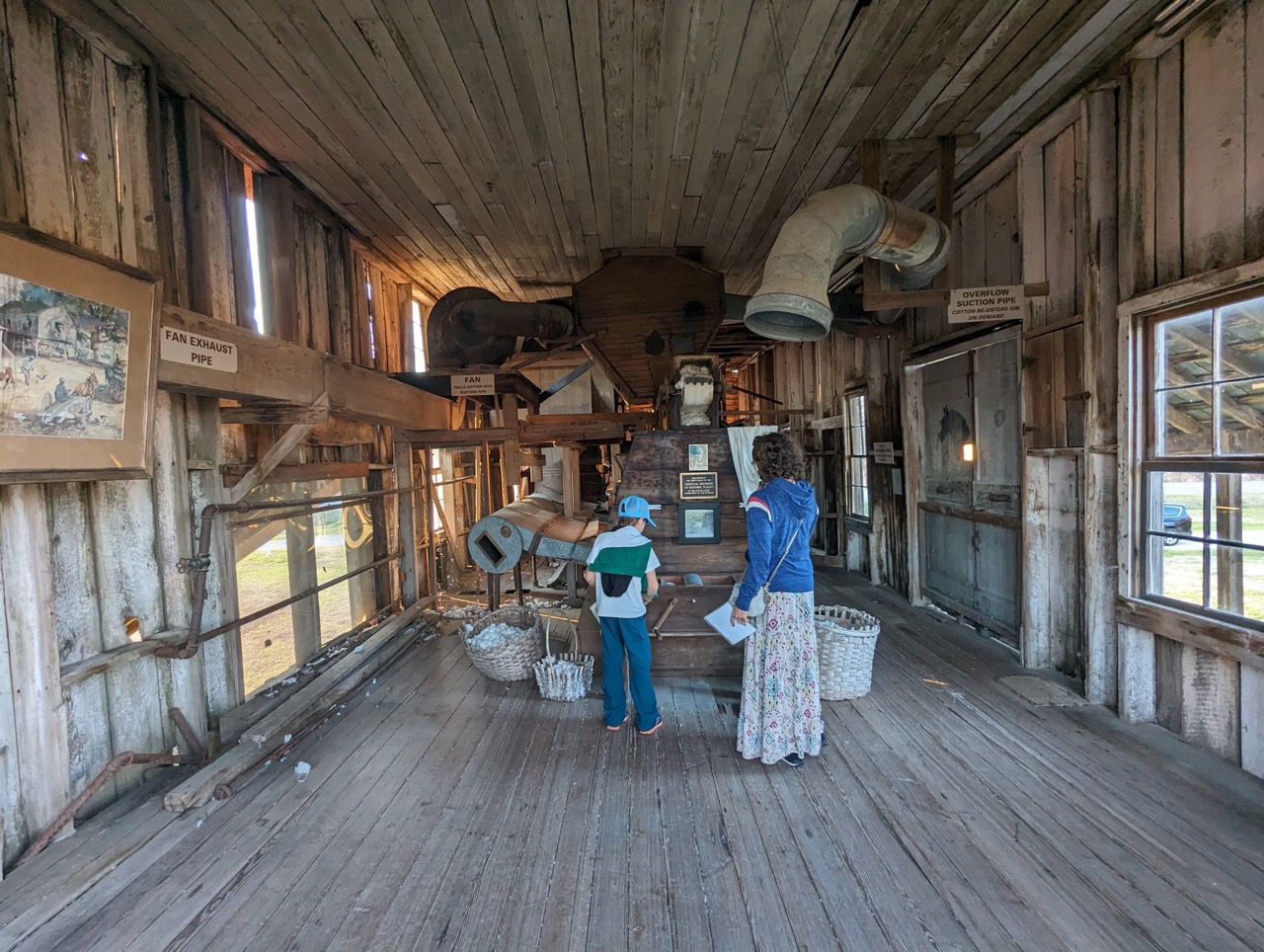 Le moulin est à 2,50 mètres du sol pour 2 raisons : la première est pour protéger le coton et le matériel en cas d’inondations si le Mississippi déborde, la deuxième c’est parce que les bêtes qui font tourner le moulin ont besoin de place en-dessous.