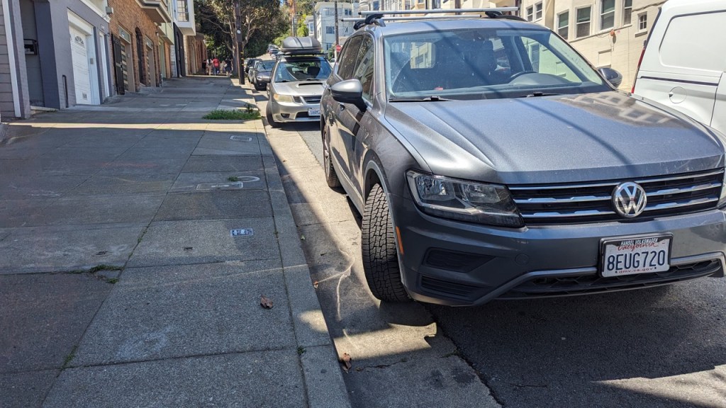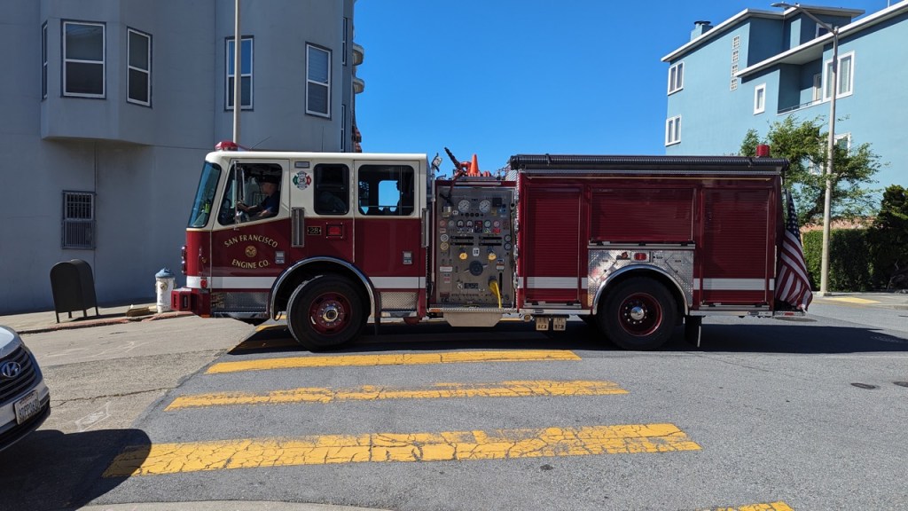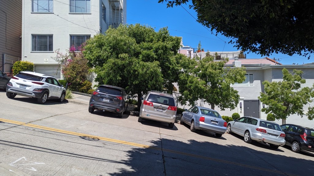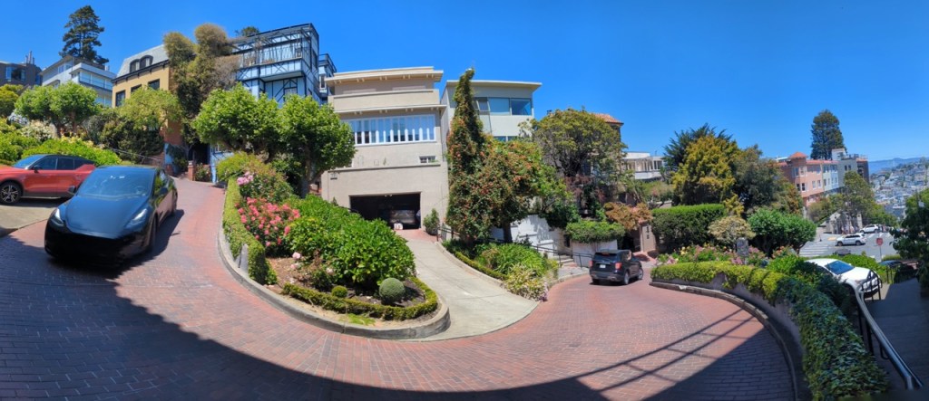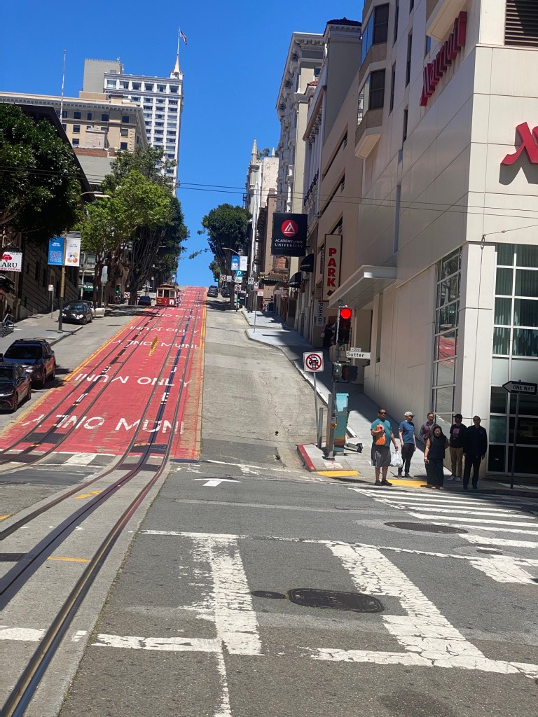 Nous commençons par un trajet en cable-car pour rejoindre la fameuse Lombard Street. Les rues sont tellement pentues que les voiture se garent en orientant les roues vers le trottoir au cas où ! Un footing doit se révéler éprouvant ici ! Les vélov sont d’ailleurs électriques ici heureusement.