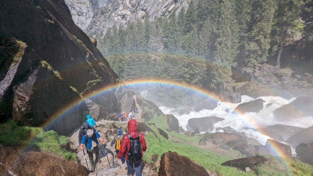 La fonte des neiges étant en cours dans le parc, le débit des chutes d’eau de Yosemite est vraiment impressionnant. Les embruns au bas des chutes nous ont complètement trempés. Nous avions l’impression qu’il pleuvait !