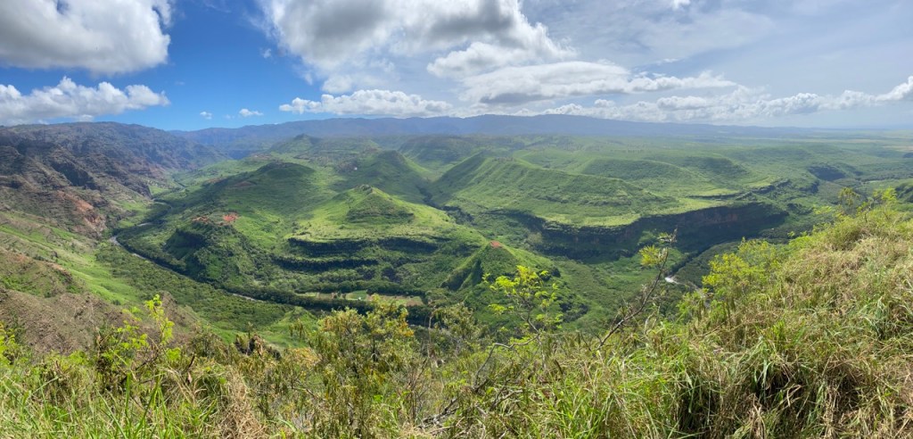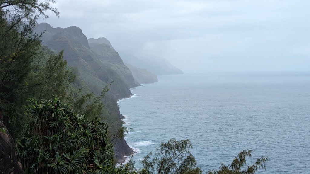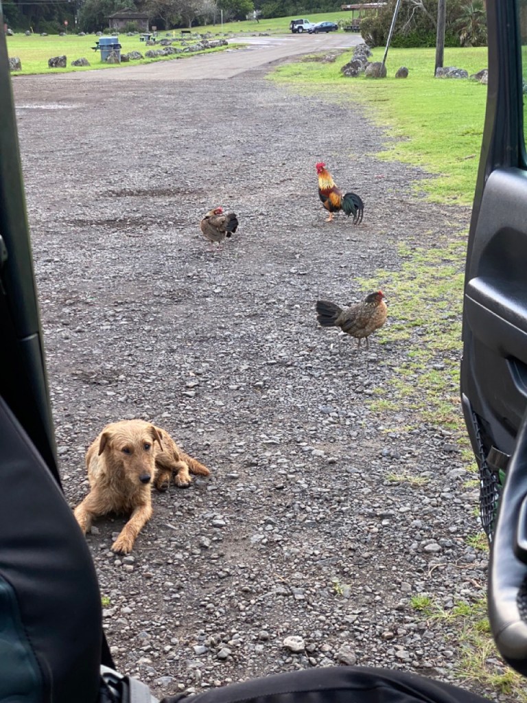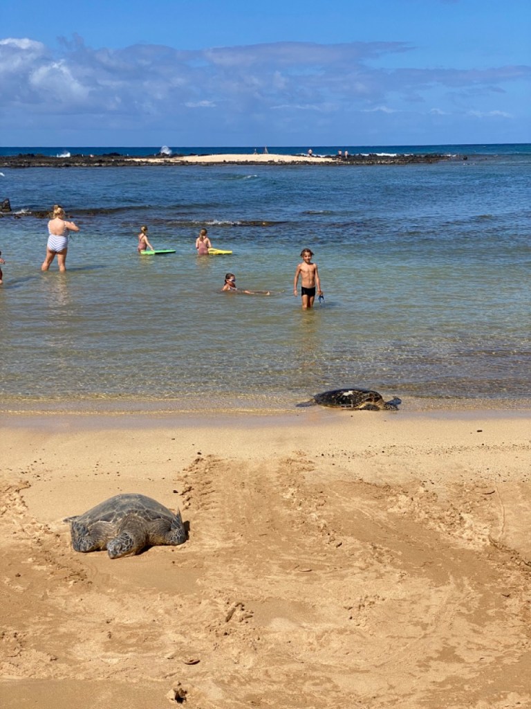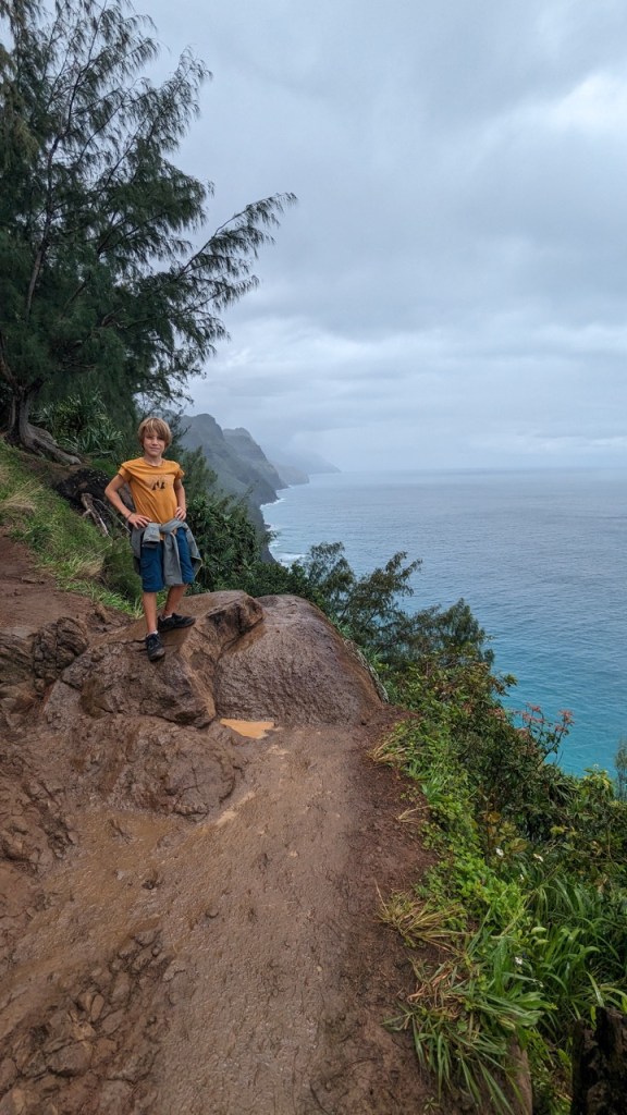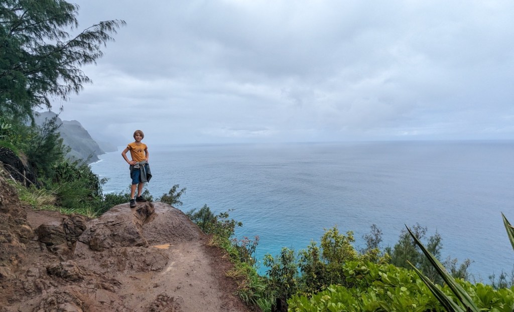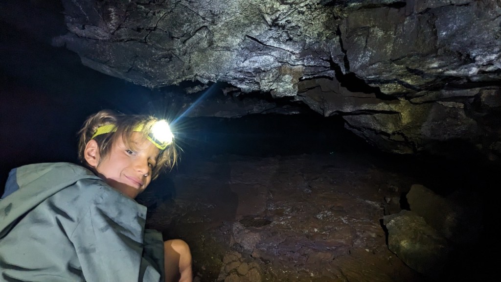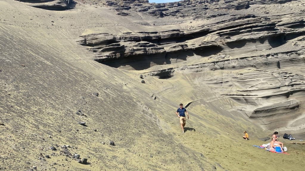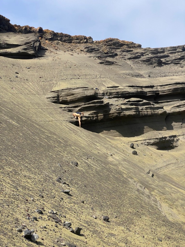 On est allé à une plage de sable vert, c’est l’une des quatre seules plages de sable vert dans le monde. Et il y avait plein de vent. Donc en enlevant mon short, le vent l’a emporté tout en haut de la falaise et on a dû attendre que le vent pousse mon short un peu plus bas pour que Papa puisse aller le chercher en escaladant un petit peu. On a tous eu très peur, mais à la fin il a réussi à l’avoir. Le sable vert vient du fait que la plage est creusée dans les cendres d’un volcan vieux de 49 000 ans qui contient une pierre semi-précieuse appelée olivine. Les vagues érodent la cendre et l’olivine s’enlève de la roche et se dépose sur la plage, créant la plage verte.