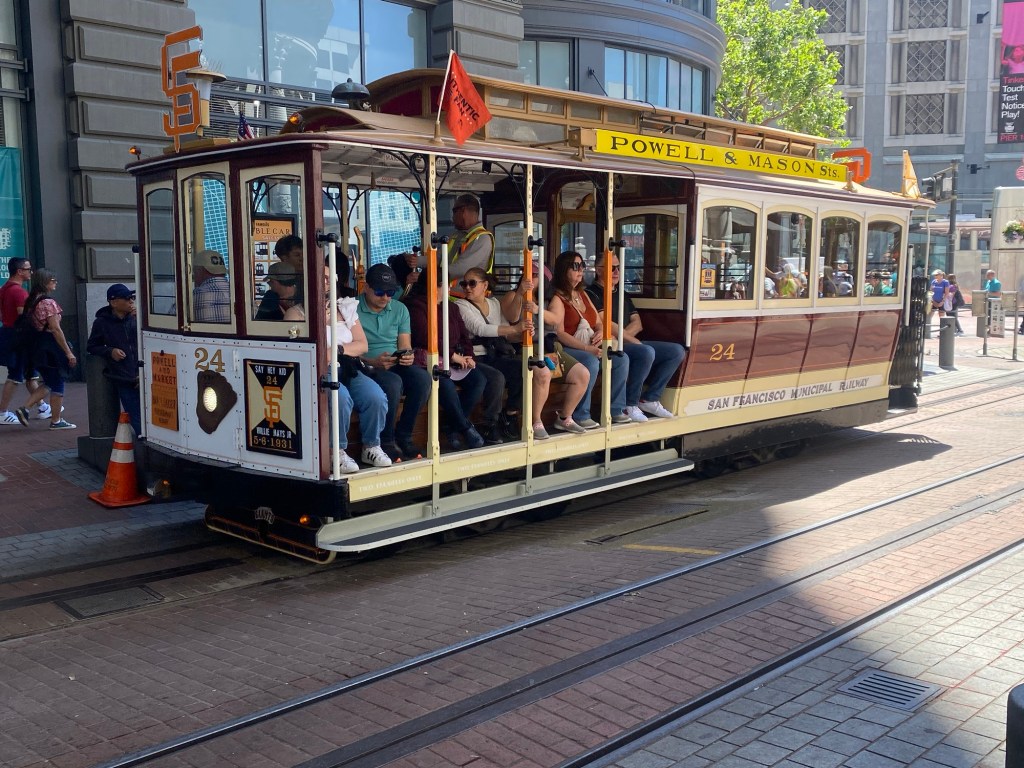 Le cable-car a été inventé il y a longtemps et c’était le moyen de déplacement des villageois de San Francisco. Maintenant, il ne reste plus que trois lignes qui sont actives. Le cable-car est comme un train avec les mêmes manettes, mais il ne roule pas. C’est des câbles qui sont enterrés sous le goudron, qui tirent le cable-car et donc le font avancer. Pour se retourner dès qu’il arrive à la fin de la piste, le conducteur arrête le cable-car sur une plate-forme de bois et la pousse pour qu’elle fasse un demi-tour. Puis le cable-car repart faire son trajet. Très pratique dans les montées au lieu de les faire en vélo, car les câbles tirent environ à 14 km/h donc les montées ne leur font pas peur. Heureusement, car San Francisco et la ville des montées et des descentes.