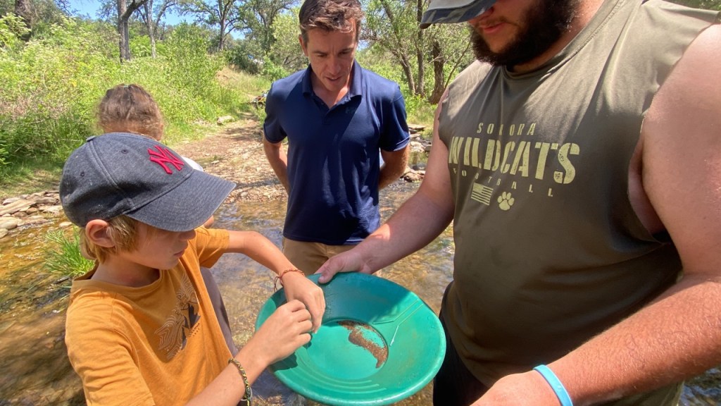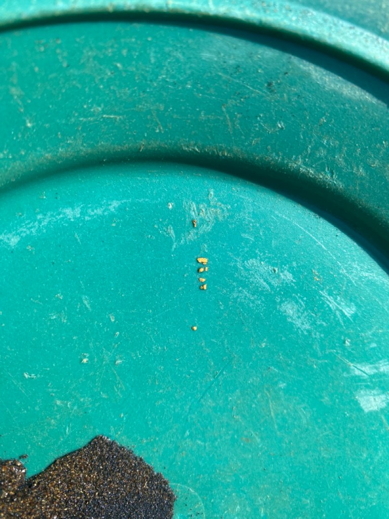 Prendre de l’argile et le mettre dans le tamisTransférer l’argile du seau à dans l’entonnoirTransférer l’argile du seau à dans l’entonnoirAprès avoir fait des ronds pour que le sable parte avec l’eau, on a trouvé des particules d’orOn place les particules dans un petit récipient rempli d’eau pour les ramener chez nous