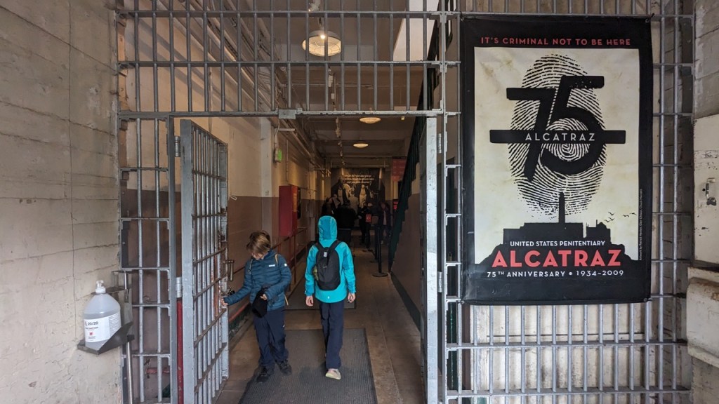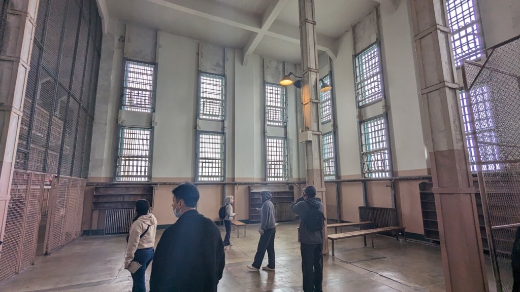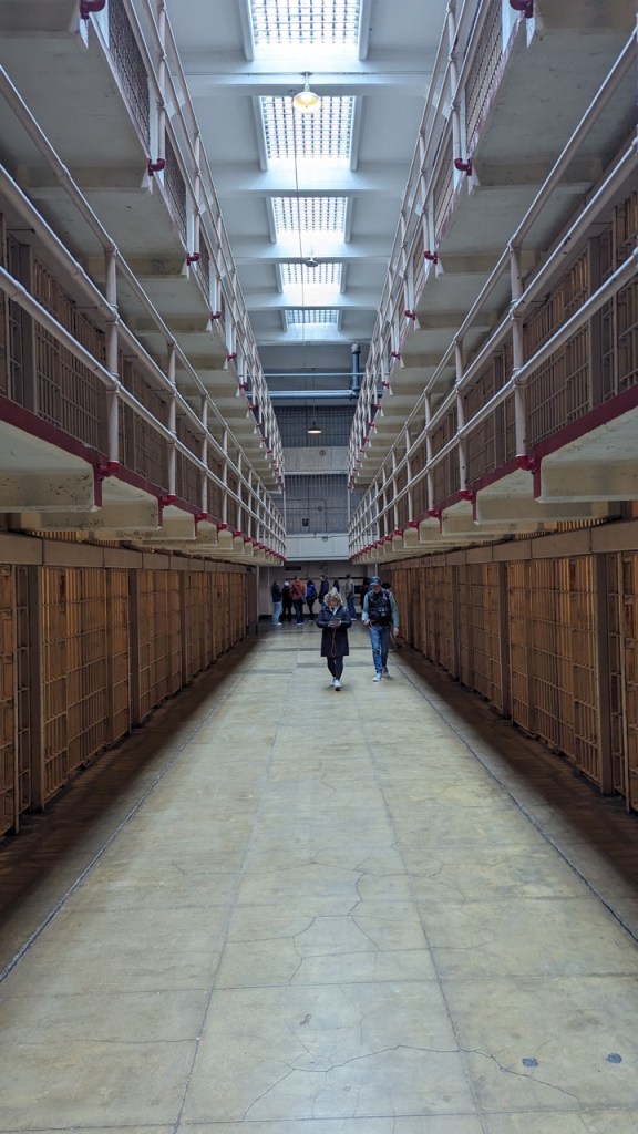 C’était juste impossible de s’évader car Alcatraz est à 2,5km jusqu’à la côte, avec des courants énormes, de l’eau gelée et des requins mangeurs d’hommes. Les prisonniers les plus célèbres sont Al Capone, Bird Man of Alcatraz et Machine Gun Kelly. Il y avait les cellules simples pour ceux qui écoutaient, ils pouvaient sortir pour aller dans la cour, jouer au baseball ou jouer au dominos (mais ce n’est pas du dominos normal, car ils ont inventé un nouveau jeu de dominos). Ceux qui étaient exemplaire avec même le droit d’être abonnés à un journal ou faire de la musique ou d’aller dehors plus longtemps que les autres. Si ils n’écoutaient pas, ils allaient dans une cellule un petit peu plus grande, mais où ils ne voyaient pas la lumière du jour et sortaient juste une fois par semaine pour aller se doucher. Ensuite, il y avait le trou où il ne voyait jamais la lumière du jour et ne sortait jamais. C’était vraiment horrible.