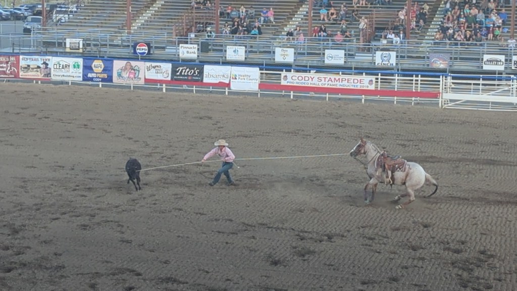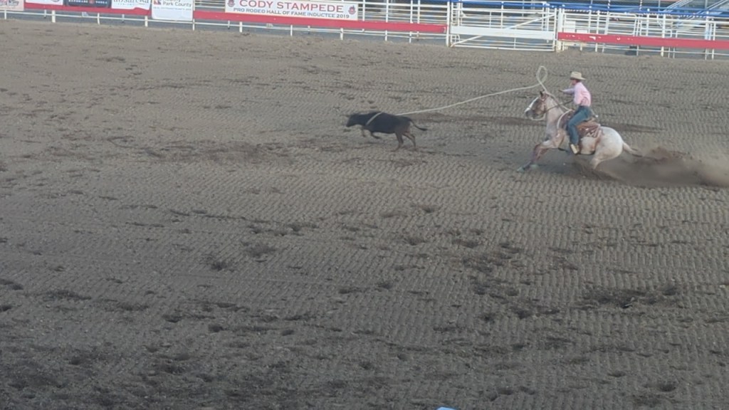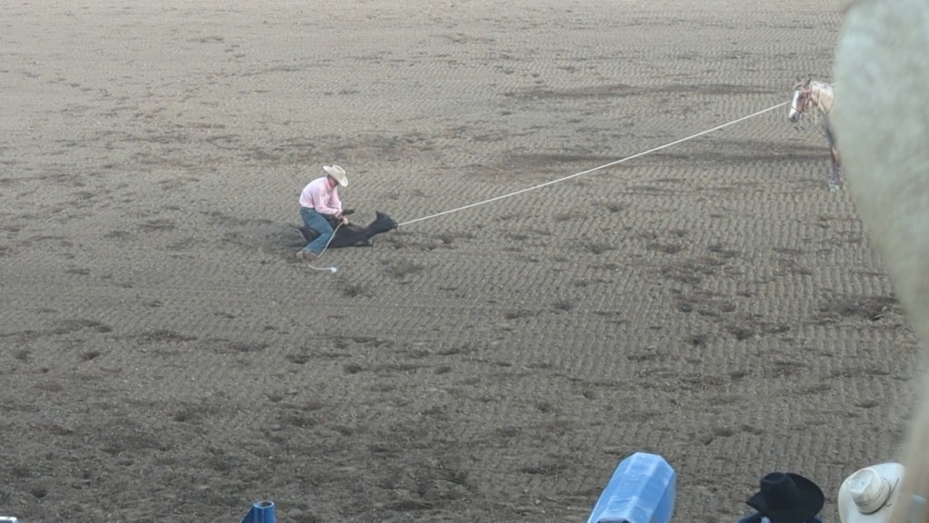 Là, les hommes devaient attraper le veau au lasso, sauter de leur cheval, aller prendre le veau, et puis le ficeler et attendre six secondes sans que le veau ne se relève. Le gagnant a été notre présentateur. Les filles ne faisaient pas ça parce que ce serait trop dangereux pour elles.