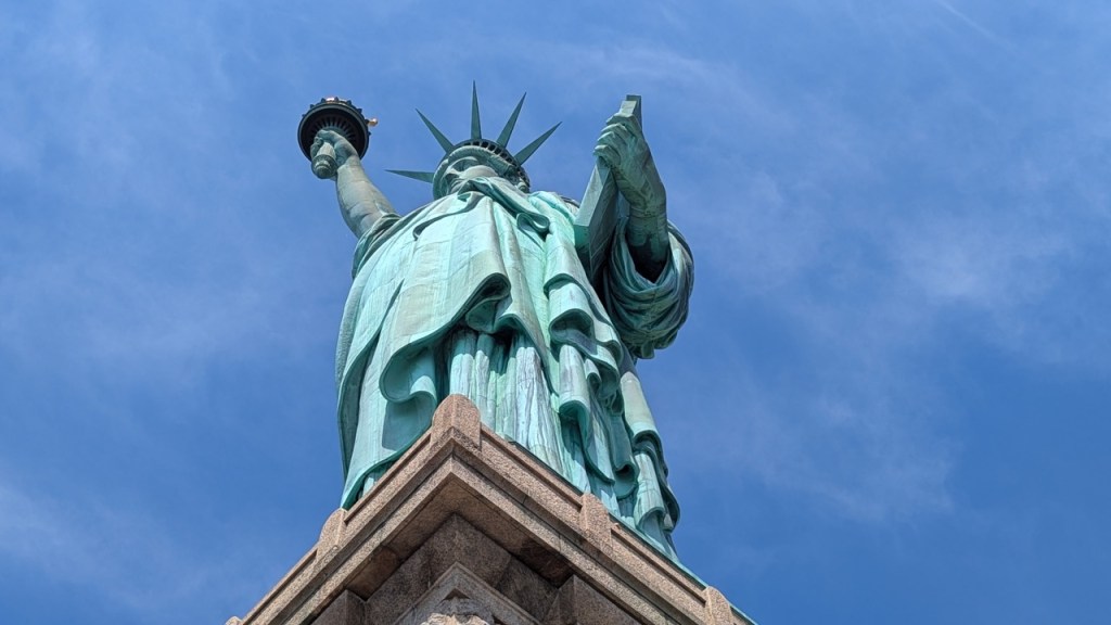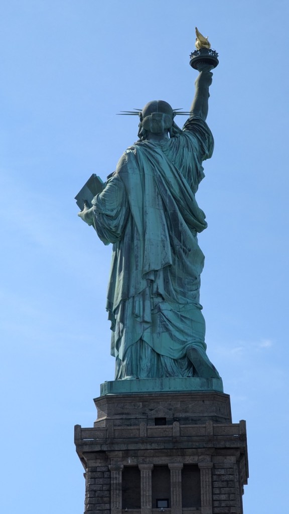 Si vous voyez de la couleur un peu doré c’est que vous avez de bons yeux. En vrai la Statue de la Liberté devait être de cette couleur. Vu qu’elle est faite du cuivre qui s’oxyde, elle devient noire, puis verte. Les gros trucs que vous voyez, c’est ce qui permet à la Statue de la Liberté d’être accrochée à son socle. On a eu de la chance, parce que Papa et Maman nous ont dit qu’on allait monter dans la couronne de la Statue de la Liberté. C’est très très rare. Donc on est monté dans sa tête et la couronne était juste là, on la voyait très bien.