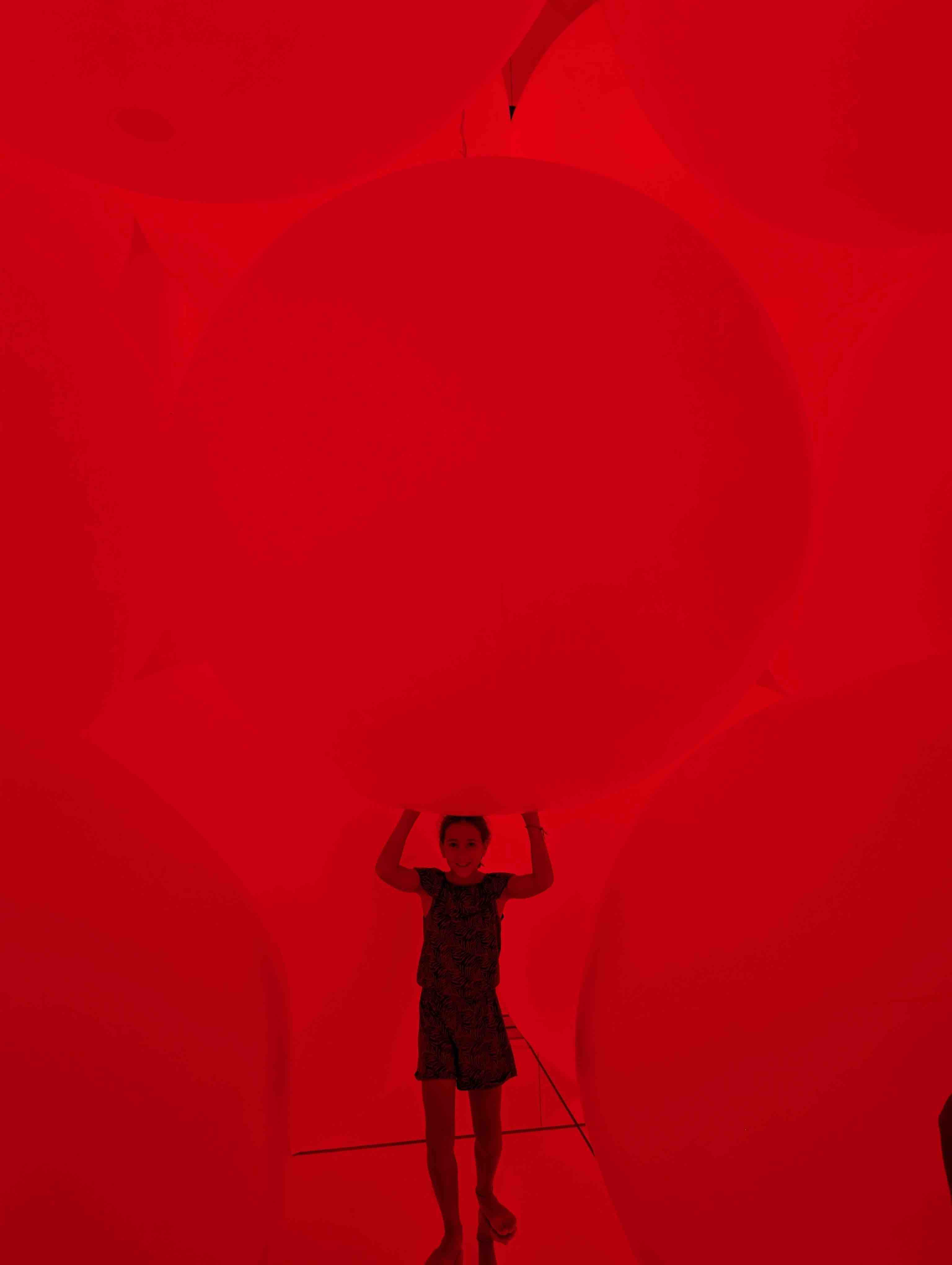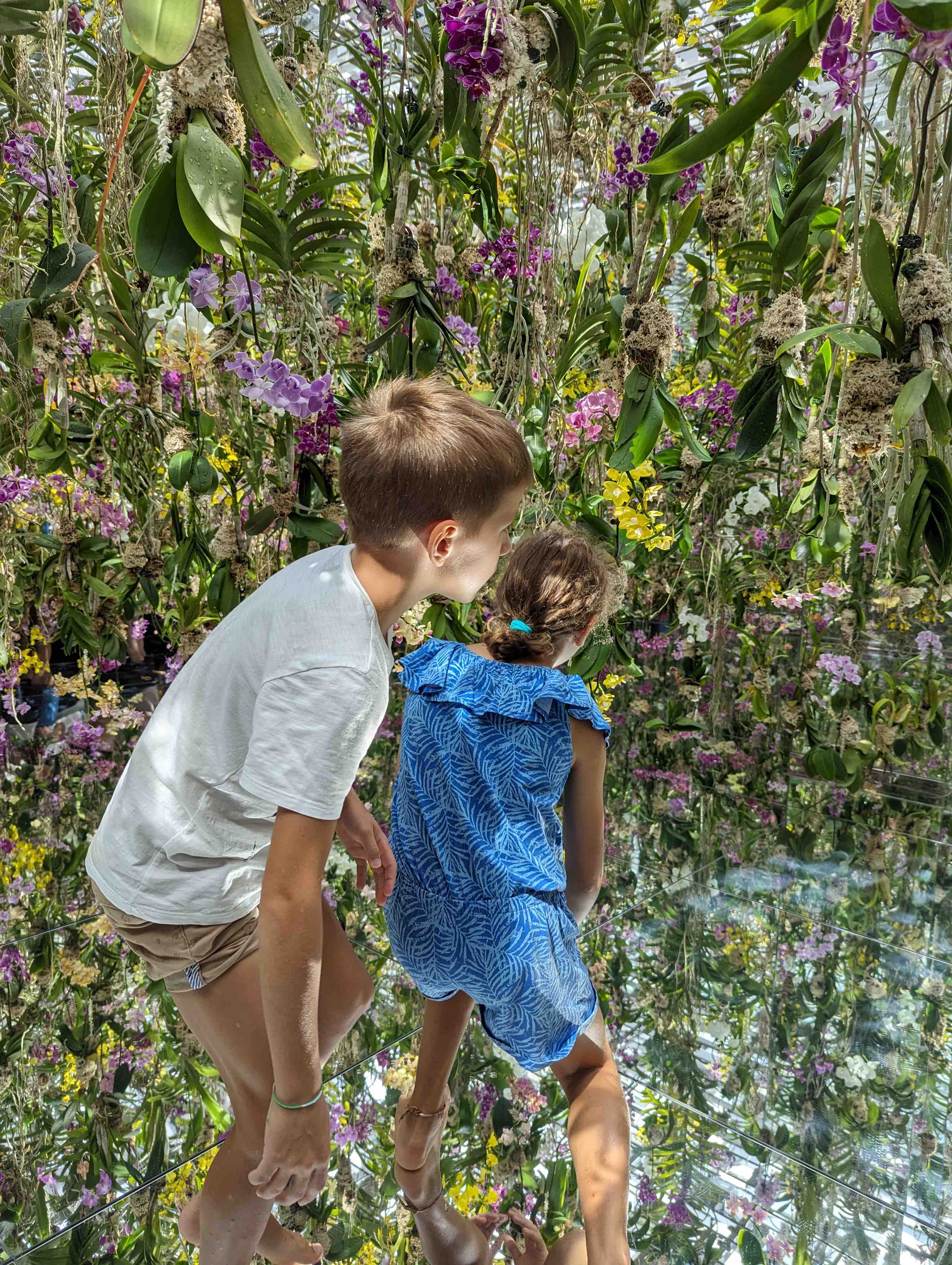 Puis on est allé voir un musée. Il était un peu particulier parce qu’on était pieds nus, on marchait dans de l’eau à certains moments, on passait entre des boules qui changeaient de couleur, et il y avait de vraies plantes suspendues qui montaient et descendaient sur nous, on était aussi entouré de guirlandes qui pendaient de haut en bas dans une salle remplie de miroirs. C’était vraiment génial.