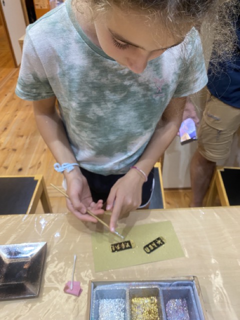 On a participé à un atelier avec de l’or. Maman et moi, on a fait des porte-clefs noirs, tandis que Papa et Axel ont choisi des récipients. Il faut coller des lettres ou des images, badigeonner de colle, et placer la feuille d’or. Par contre il ne faut pas éternuer ni tousser sinon elle est réduite en poussière…Ensuite on tamponne la feuille, on enlève les autocollants, on nettoie pour enlever l’or qui déborde, et on ajoute des paillettes si on a envie. Il ne reste plus qu’à vernir (une étape faite par les animatrices).