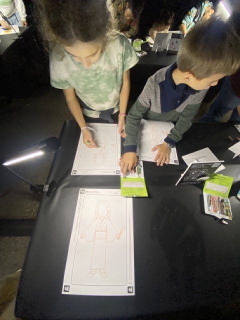 On a dessiné un personnage à la craie grasse pour participer à une animation dans une exposition dans le jardin du château de Kanazawa. On scannait nos personnages et ils apparaissaient sur l’écran géant. C’était rigolo !