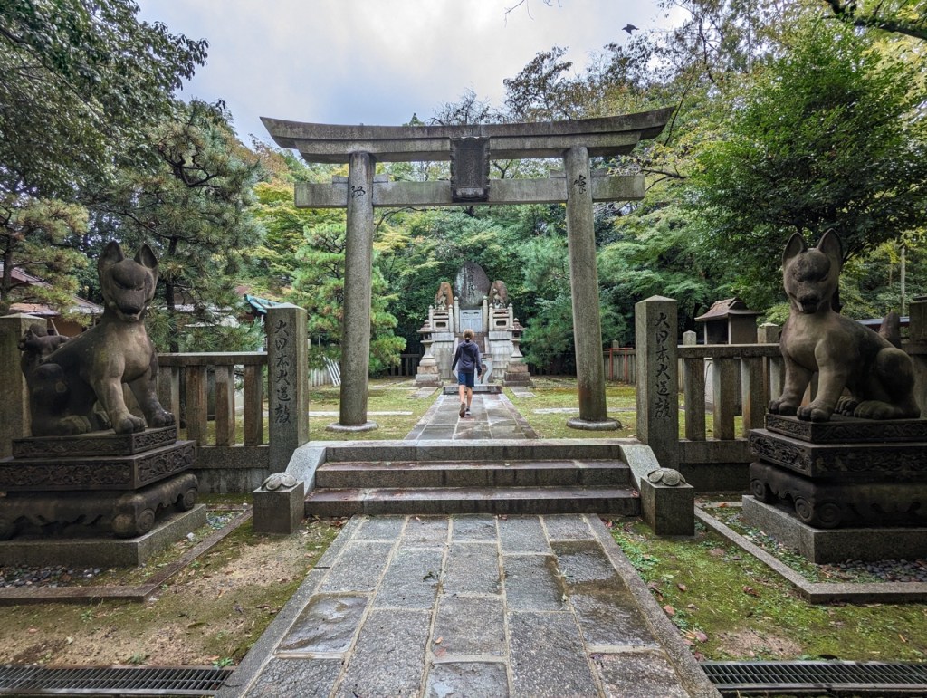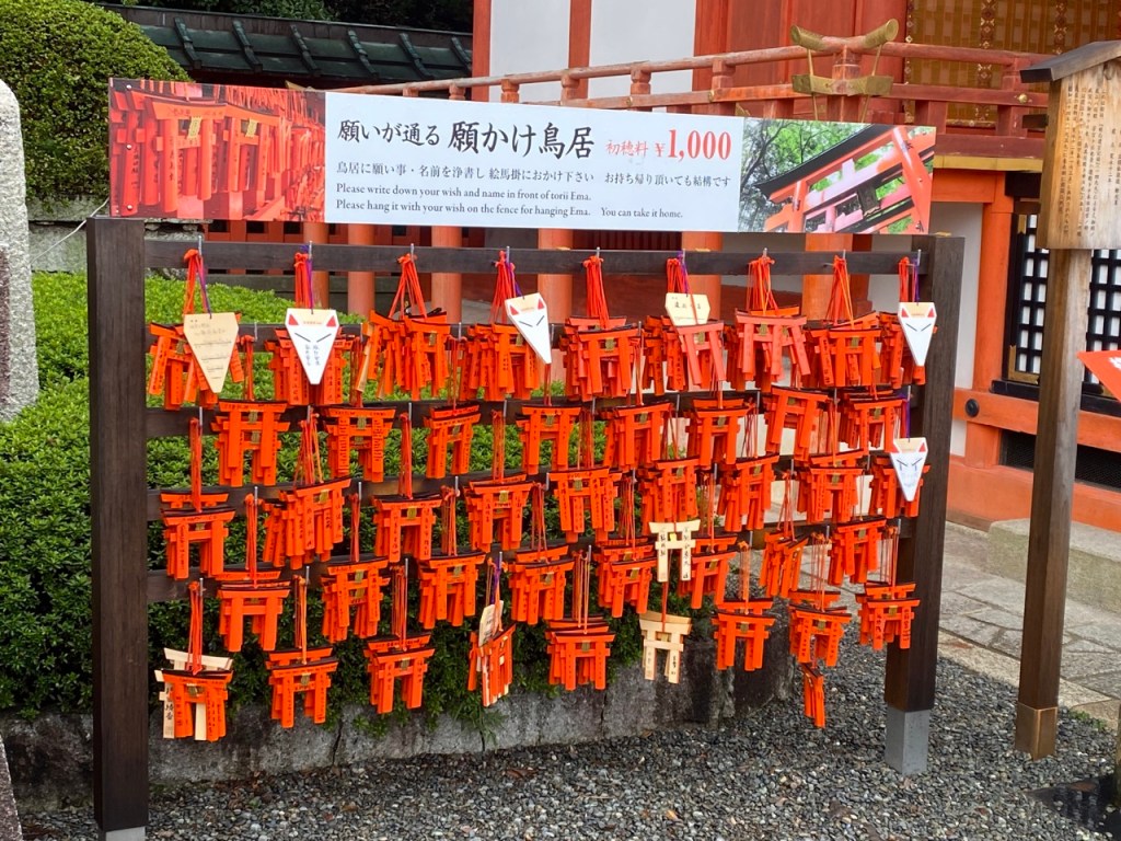 A Fushimi-Inari, il y a un chemin de 4 kilomètres, rempli de toris rouges aussi serrés qu’on peut le voir sur la photo. Il y en a environ 10 000 ! Les amulettes sont en forme de tori ici, contrairement aux autres temples où ce sont des rectangles de bois ou des petits sachets.