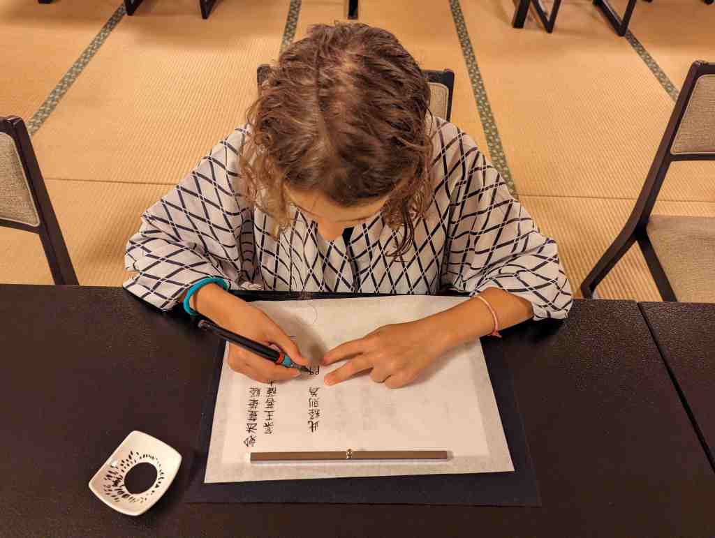 Nous participons au recopiage des sutras. Ce n’est pas facile, mais plaisant. Léa et moi pensions ramener un souvenir typique à la maison, mais une fois terminé le moine nous les a pris pour les offrir à Bouddha. Trop dégoutées !!!!!
